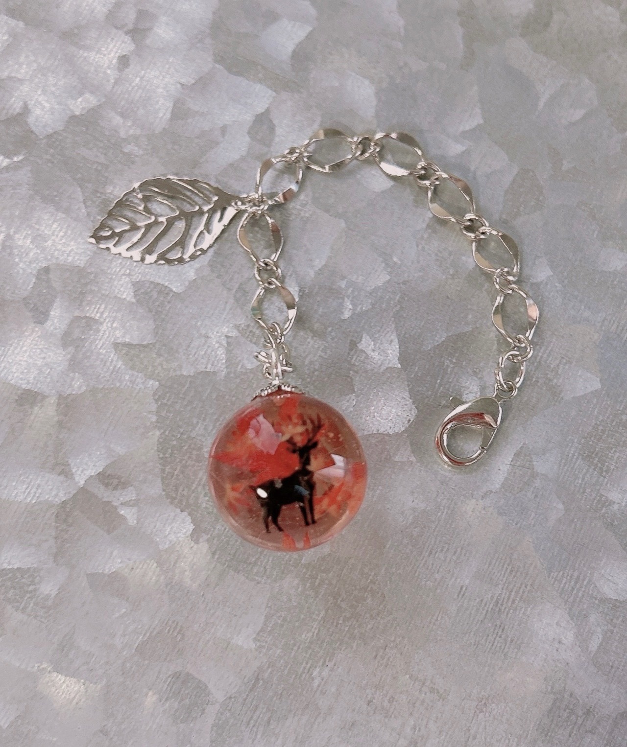 表裏で見え方が変わるレジンで作った秋玉バックチャームになります。紅葉と鹿の組み合わせは秋らしく可愛いです。