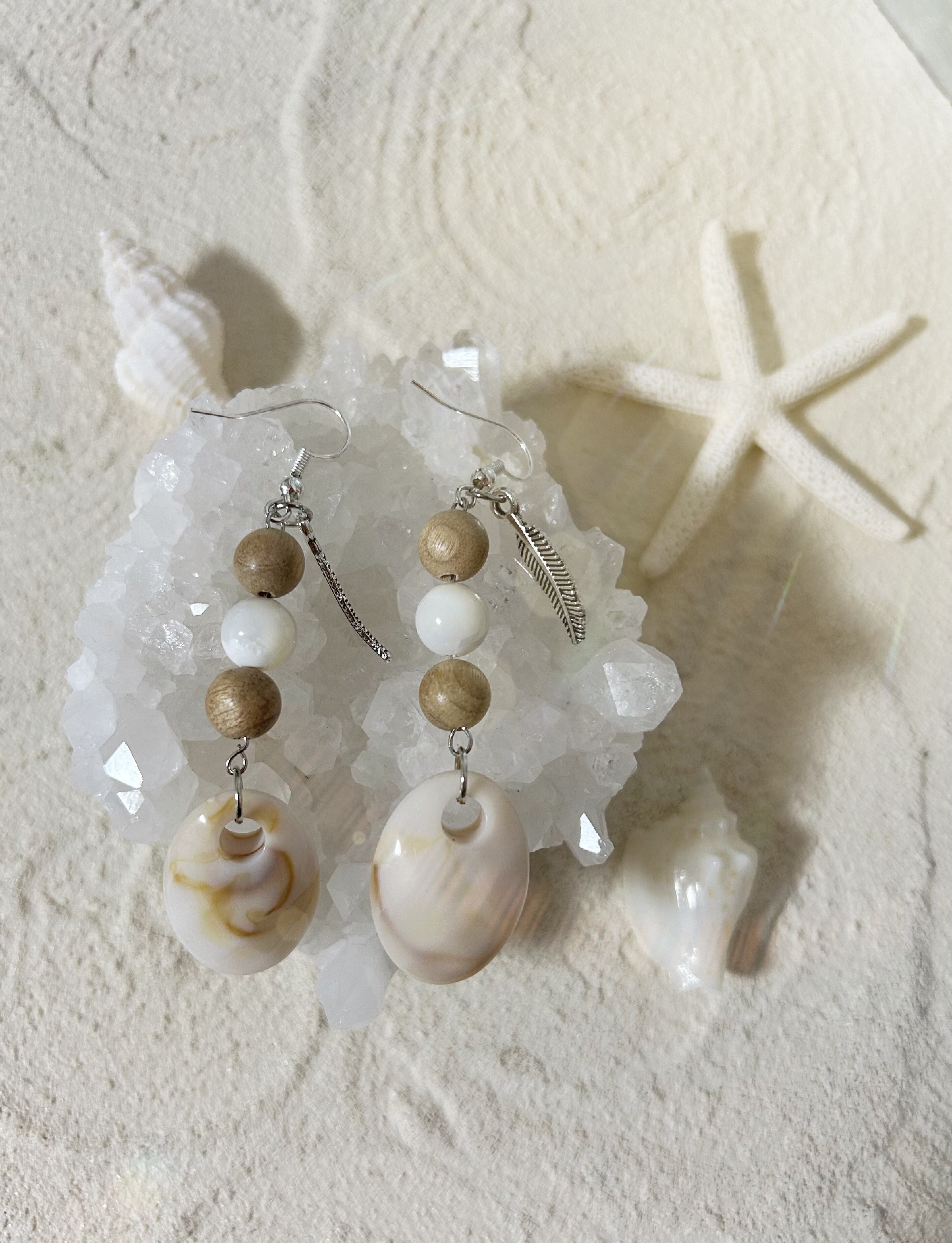 ウッドビーズとマザーオブパール(8ミリ玉)を合わせて作った夏にピッタリのピアスです。 ※下の飾りはマザーオブパールではありません
